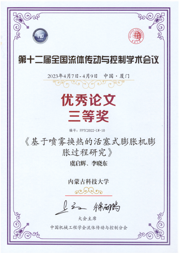 公司2020级研究生李晓东在优秀论文会场作了题为《基于喷雾换热的活塞式膨胀机膨胀过程研究》的学术报告,并荣获优秀论文三等奖。