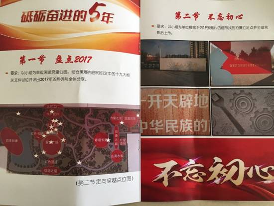 活动分为两个部分。第一部分“盘点2017”,大家集体参观党建公园,结合展览内容和党的十九大报告评出2017年的时政热词,并分享讨论。第二部分“不忘初心”,以小组为单位回答手机APP上关于党的十九大的知识竞答题目,最先完成题目的进入下一关卡,即借助地形图,按规定的顺序寻找标绘点,然后根据提供的19张照片的细节找到拍摄立足点,以相同的角度进行全体组员合影,最短时间内完成任务者获胜。