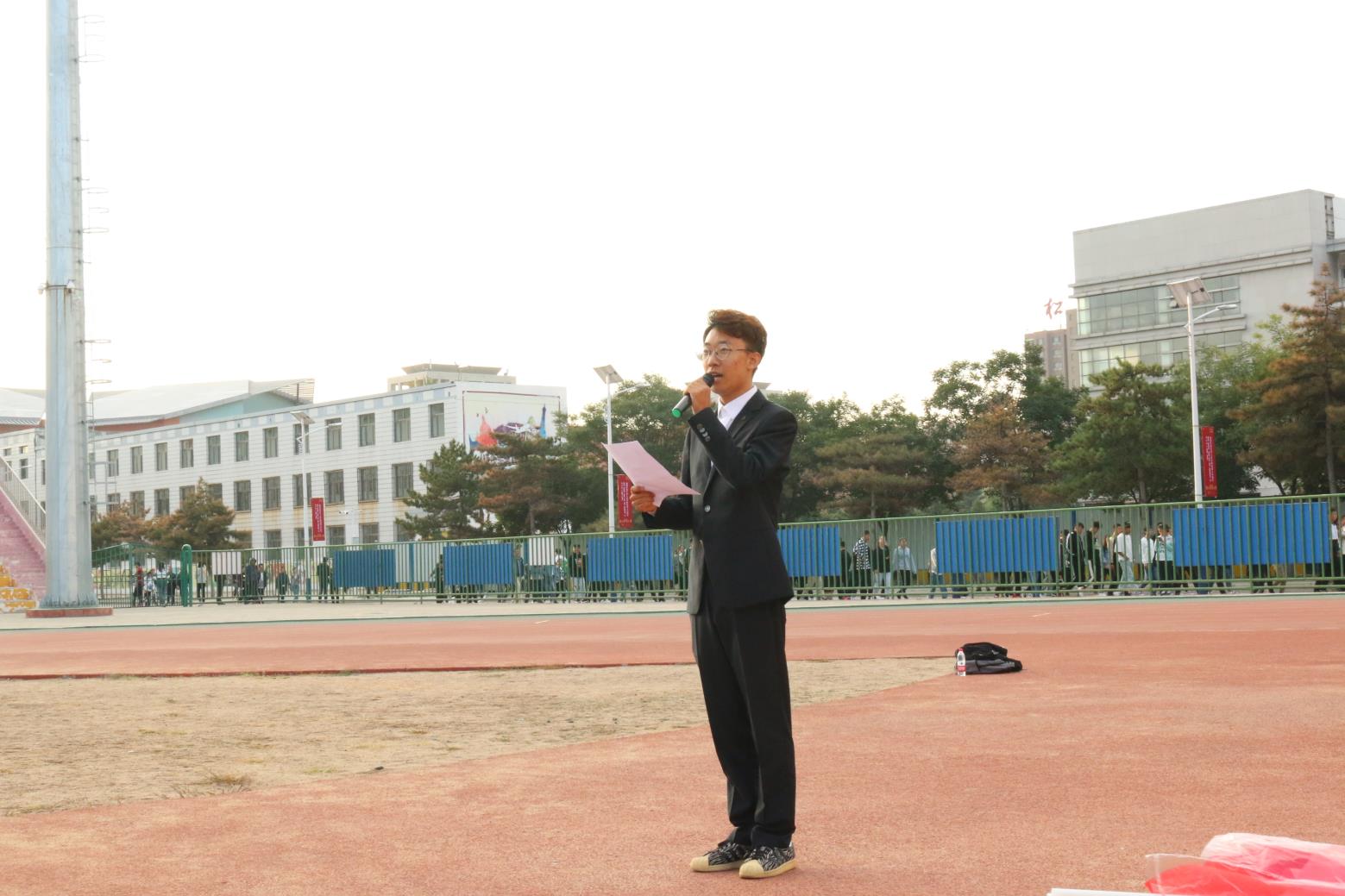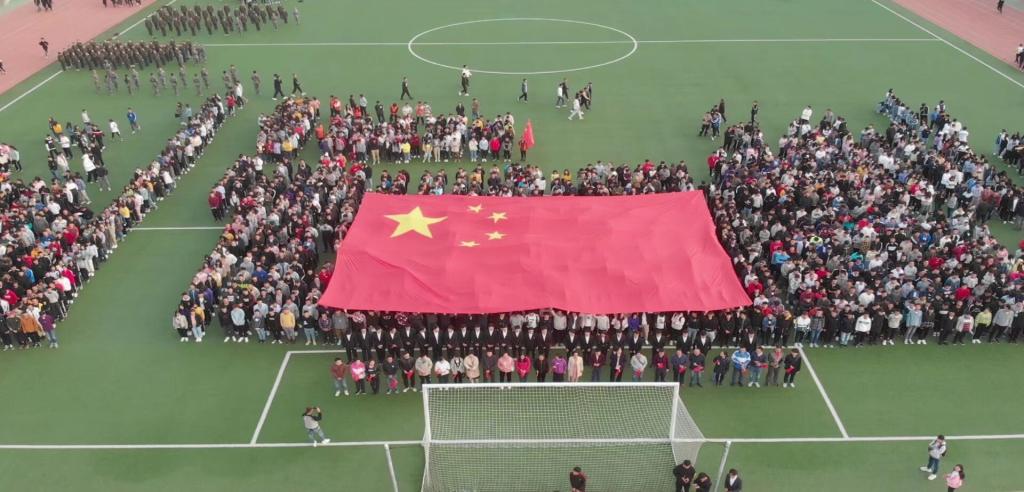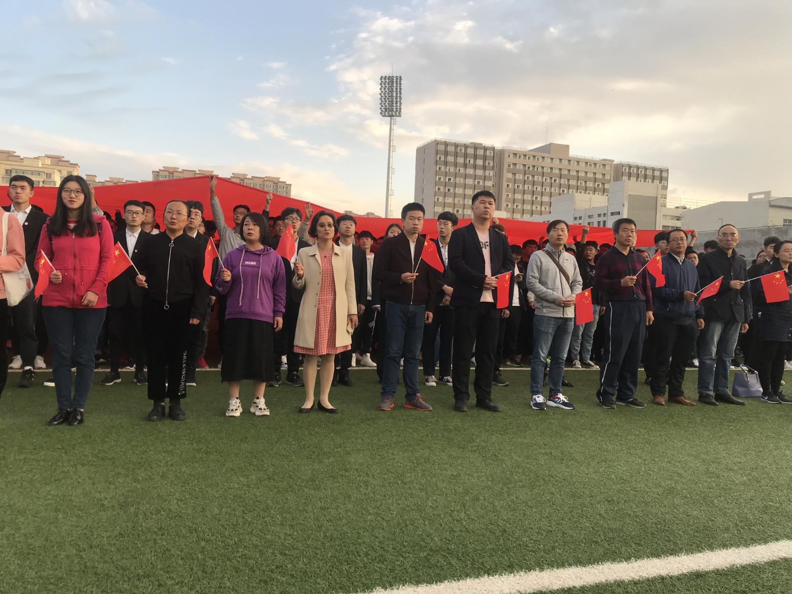 五星红旗伴随着庄严雄壮的国歌声徐徐升起,全体师生肃立致敬、齐唱国歌。随后,18级员工代表康玉凯在国旗下发表演讲《岁月峥嵘 祖国长青》。他指出,站在新中国成立70周年的康庄大道上,回顾祖国波澜壮阔的七十年,广大青年学子要铭记逐梦之路的苦难和荣光,秉承家国天下的情怀,把个人理想融入到国家和民族的事业中去,用勤奋与拼搏,书写中华民族更加辉煌的未来。最后,在场一千多名师生挥动小国旗,饱含深情演唱了《歌唱祖国》,对祖国的热爱之情在齐声放歌中得到升华。在歌声中,操场中央的50多名员工用自己的双手高高撑起了一面巨幅国旗,点燃了每一位学子炽热的心。