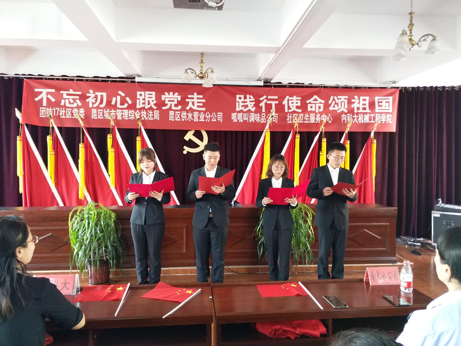 9月25日下午,伟德官方网站联合团结17社区在团结街道党群服务中心会议室开展“不忘初心跟党走,牢记使命颂祖国”互联互动活动。参加活动的有公司党总支、团结17社区党委、昆区城市管理执法局第一党支部、供水总公司昆区营业所党支部、包头市呱呱叫调味品公司、团结大街派出所党员代表,以及辖区居民代表等共计100余人。