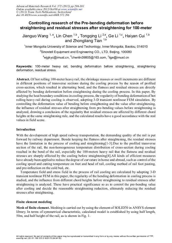 本项目从钢轨轧后弯曲变形和矫直变形二方面进行系统的理论及实验研究。研究热应力、相变应力条件下弹性、弹塑性变形问题;探究钢轨冷却过程中的弯曲变形机理、演变规律;寻找预弯量与弯曲变形、残余应力之间的关系;通过计算,分析钢轨矫前弯曲度对矫后残余应力、平直度的影响;研究多辊双平面复合矫直过程的弹塑性变形区的应力、应变分布规律,找出预弯量、矫直变形对矫后残余应力、平直度产生影响的主要因素。通过揭示钢轨在轧后冷却弯曲变形以及由此对矫直变形中残余应力形成产生的影响,从而找出钢轨矫直后既满足平直度要求,又符合矫后残余应力条件的主要影响因素。该项目研究对于实现高速钢轨高精度、高平直度的生产有着重要的理论指导意义。