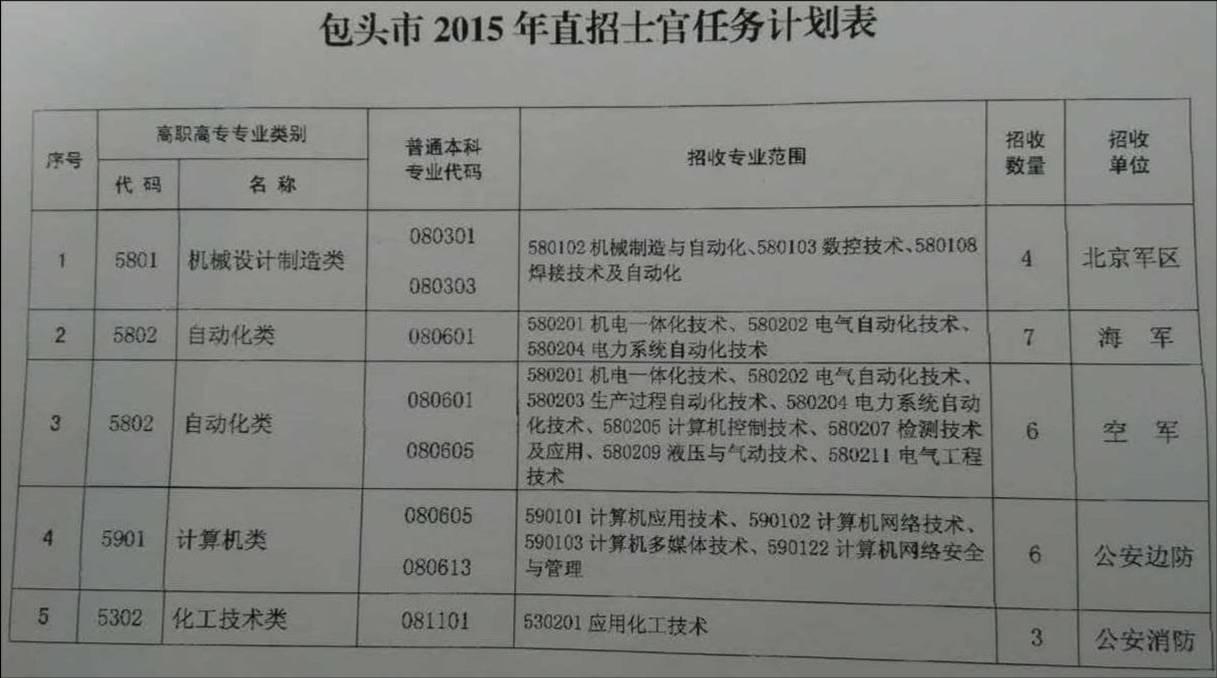 2015年包头市直招士官招收计划已经下达,符合附件中专业条件的2015年应、往届毕业生可以前往全国征兵网(