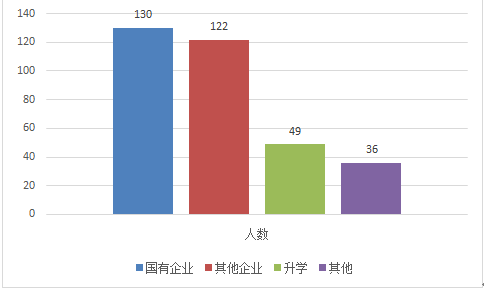 从毕业去向上来看,除升学外,员工就业单位的性质主要包括机关,国有企业,其他企业,科研设计单位,三资企业等。其中到国有企业和民营企业就业的同学人数最多。具体情况如下图: