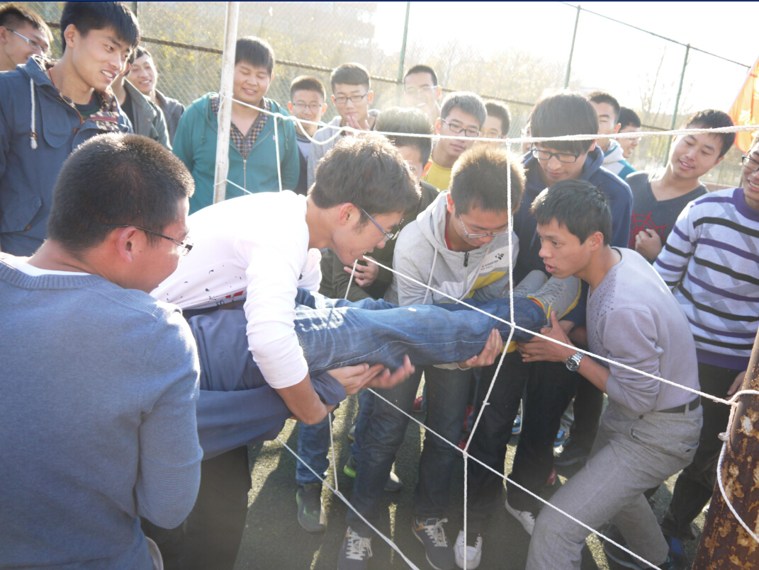 活动开始,全体学员分成了11组,并且要求各个队伍在5分钟之内确定好自己队伍的队委和自己队伍的口号等。整个素质拓展,共有四个项目,分别是:坐地起身、盲人方阵、生死电网和雷阵图。其中生死电网环节,将活动气氛推向高潮,学员非常踊跃。