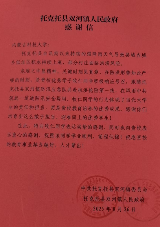 近日,伟德官方网站收到了一封来自托克托县双河镇人民政府的感谢信。信中对公司2022级机械设计制造及其自动化专业牧仁同学在防汛抗洪中的英勇表现给予了高度赞扬,并向公司致以诚挚谢意。